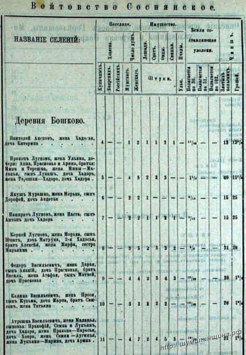 В 1781 году в Соснянском войтовстве деревня Бошково. Проживают 8 хозяев купеческого происхождения с семьями: Пантелей Ак?пов, Прокоп Лугнов, Якуш Мурашко,Панкрат Лугнов, Корней Лугнов, Федор Васильевич, Калина Васильевич, Атрошка Васильевич (всего 56 человек).