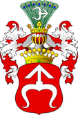 Герб Хрептовичей: под графской короной в поле червлёном стрела серебряная, вылетающая из лука с оторванной тетивой. Та же фигура вкось видна и на павлиньих перьях в нашлемнике. Герб этот в X веке перенесён из Моравии.