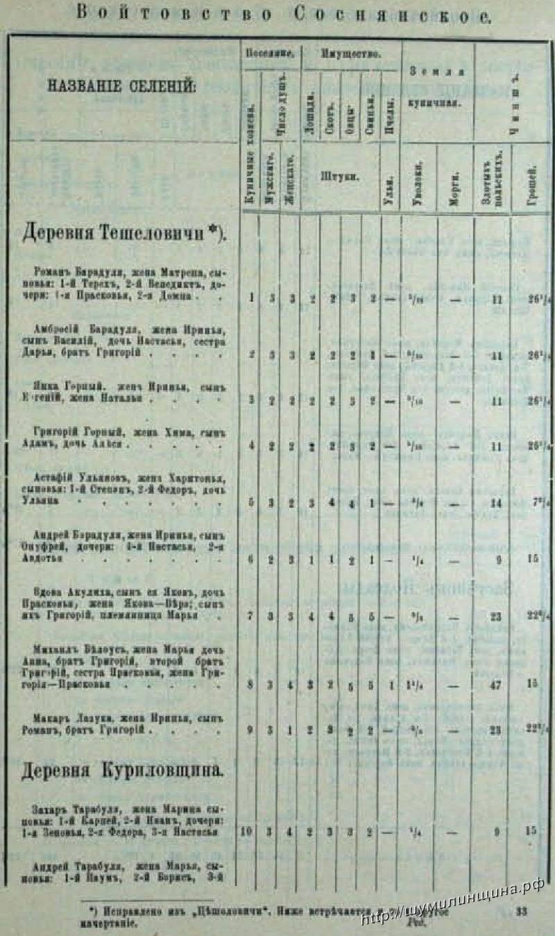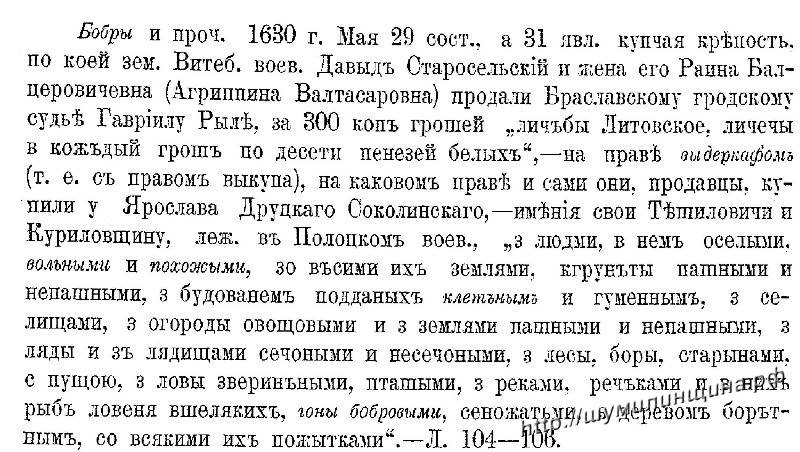 В историко-юридических материалах 1892 года есть запись от 29 мая 1630 года. В ней Давыд Старосельский и жена его Раина Балцеровичевна (Агрипина Валтасаровна) продали Браслвскому городскому судье Гавриилу Рыле, за 300 копь грошей.... с правом выкупа, на каком праве и сами они, продавцы, купили у Ярослава Друцкаго Соколинского, - имения свои Тешиловичи и Куриловщину, леж. в Полоцком воеводстве.