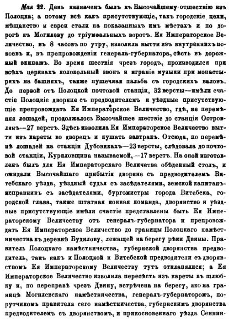 Путь пролегал из Полоцка по тракту, через Дубовики и Куриловщину, далее на Будилово и Сенно. В Куриловщине был торжественный прием Витебским дворянством. Так что тракт Екатерининским в этих местах назывался вполне обосновано.