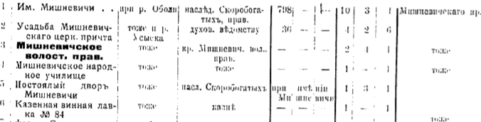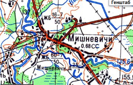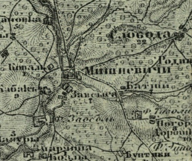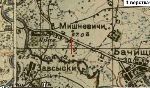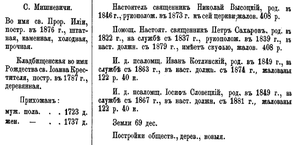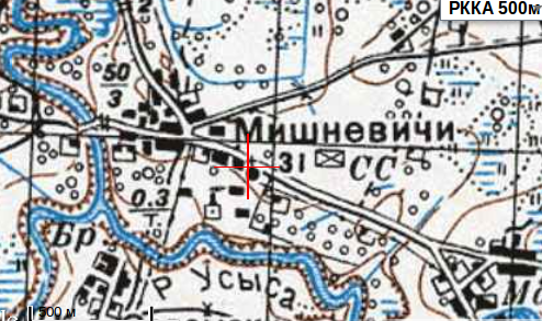 Леший, я Вам больше скажу, на 1884 год в Мишневичах была не одна, а две церкви: каменная, св.Ильи, 1876 года и деревянная, кладбищенская, Рождества Иоанна Крестителя, 1787 года (!). Было 4 служителя: настоятель Николай Высоцкий, 1846г.р, на службе с 1873 года, пом. настоятеля Пётр Сахаров, 1822 г.р, на службе с 1879 года, псаломщики Иван Котлинский и Иосиф Словенский, оба 1849 года рождения. Приход церкви был достаточно большим, 1723 душ муж и 1737 жен пола. На картах каменная церковь присутствовала ещё в 1943 году, следы её найти нетрудно, смотрите карты на заставке в районе перекрестия, сейчас это судя по всему юго-западная часть перекрестка. Кладбище было по центральной улице, на этой же стороне, ближе к мосту.