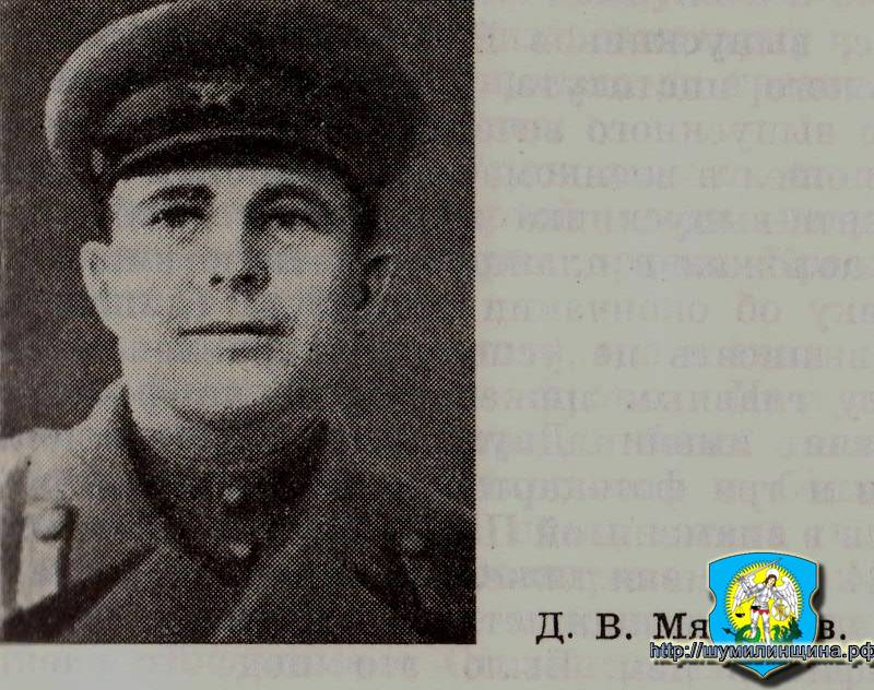 Братство, рожденное в бою Незадолго перед войной коммуниста Дмитрия Васильевича Мясоедова направили работать в политотдел Сиротинской МТС. Оттуда он и ушел защищать Родину. Про¬шел путь от курсанта военного училища до капитана, командира стрелковой роты. Несколько раз был ранен, но после госпиталя вновь становился в строй. В дни освобождения Витебска перед разведротой капитана Мясоедова была постав¬ила задача: взаимодействуя с саперным и взводом старшего сержанта Ф. Т. Блохина, захватить мост через Западную Двину, не дав противнику его взорвать. По нему должны двигаться на запад советские танки, мотопехота. Гитлеровцы заложили под мост огромные заряды тола, подвели бикфордов шнур. Ждали только, когда переправятся их войска, сразу же после этого мост должен был взлететь па воздух. Воины капитана Мясоедова и старшего сержанта Блохина прорвались по берегу реки к мосту. IIIквал автоматного огня обрушили они на фашистских солдат. В самый разгар перестрелки Блохин бросился на мост, быстро отыскал там и перерезал уже горевший бикфордов шнур. Мост был спа¬сен! Непрерывным потоком двинулись по нему советские войска. Словно родные братья обнялись горьковчанин Блохин и шумилинец Мясоедов. Родина высоко оценила подвиг старшего сержанта Ф. Т. Блохина. Ему было присвое¬но звание Героя Советского Союза. К пра¬вительственной награде за спасение моста был представлен и Д. В. Мясоедов. Ордена¬ми Отечественной войны 1-й и 2-й степени, орденом Красной Звезды, многими медалями отмечен его боевой путь. Осенью 1944 года капитан Мясоедов демо¬билизовался. Долгое время он работал в Шумилинском райисполкоме, был председа¬телем колхоза имени В. И. Ленина. Не угасла возникшая в суровые военные дни дружба Мясоедова с Блохиным. Не раз они встречались в родном для них обоих Витебске во время празднования Дня Побе¬ды, писали друг другу письма. В 1960 году Федор Тимофеевич прислал Дмитрию Ва¬сильевичу свой фотопортрет с надписью: «Дмитрию Васильевичу в память нашей совместной борьбы с фашистскими оккупан¬тами за освобождение Витебска». В последние годы жизни Д. В. Мясоедов был тяжело болен. Но он продолжал рабо¬тать, руководил партийной организацией колхоза имени В. И. Ленина. 21 апреля 1964 года Д. В. Мясоедов умер. Похоронили его на братском кладбище воинов Красной Армии и партизан Великой Отечественной войны в Шумилино. Его именем названа улица в Шумилино. В.А. Нарушевич(Изкниги«Память. Историко-документальная хроника Шумилинского района»)