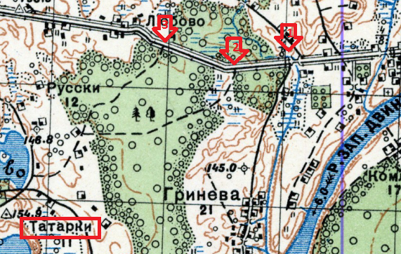 На довоенной карте после поворота на Гринево показаны два поворота с почтового тракта в сторону деревни Татарки, видимо одна из дорог и есть Татарская, скорее всего расположенная ближе к Любово. В Татарках эта дорога переходила в торговую Сиротино-Сенно через Будиловскую Пристань.