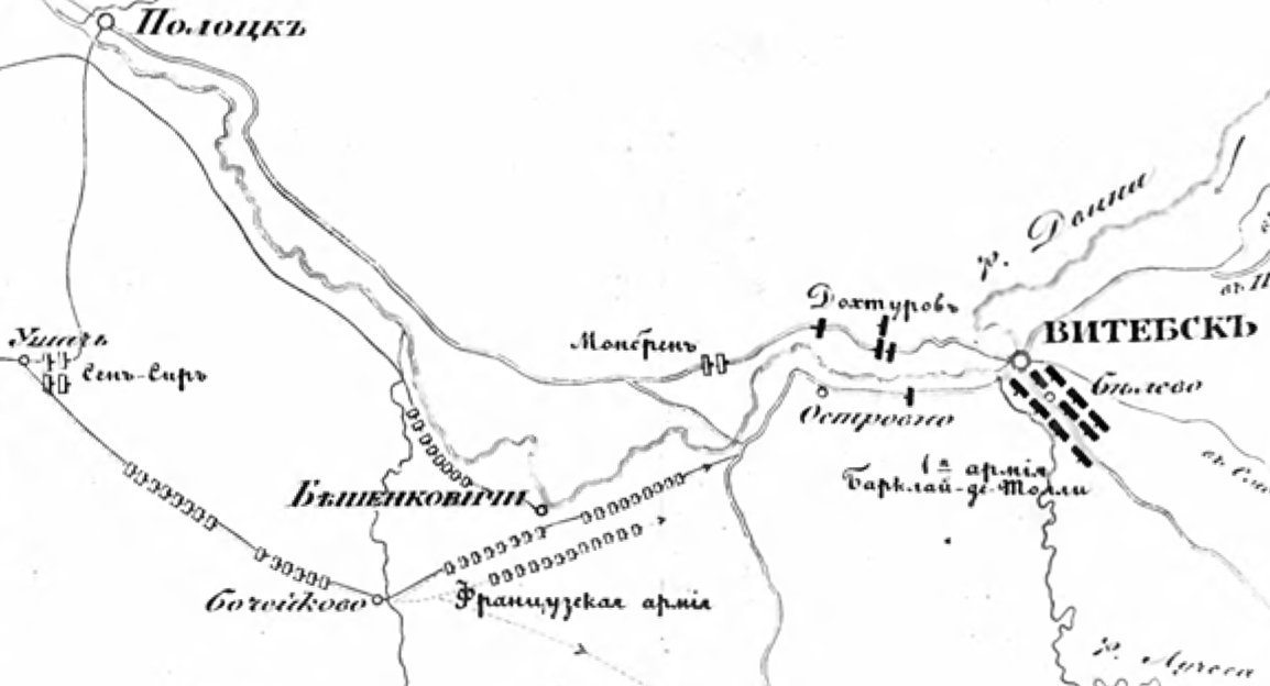 Немного истории о войне 1812 года в этих местах: факты Из "Боевого календаря-еженедельника Отечественной войны 1812 г" Н.П.Поликарпова. "Дела и стычки на Большой Полоцко-Витебской дороге 1-я Западная армия. Часть арьергарда 6-го пехотного (генерала Дохтурова) корпуса под начальством генерал-майора графа Палена – батальон 40-го егерского полка (майора Букинского), Сибирский драгунский, Мариупольский гусарский полки, 4 орудия пешей артиллерии. Отряд генерал-майора графа Орлова-Денисова – лейб-гвардии Казачий полк и гвардейская Черноморская сотня. Генерал-майор граф Пален, отступив 3 версты от пункта соединения дороги из местечка Бешенковичи с Большой Витебской дорогой, оставил в этом пункте отдельный отряд под начальством шефа Сибирского драгунского полка полковника барона Крейца в составе батальона 40-го егерского полка, Сибирского драгунского, Мариупольского гусарского полков и 4 пеших орудий. Так как дорога в местечко Бешенковичи была лесистая, то полковник барон Крейц, отправив два эскадрона Мариупольского гусарского полка вперед к местечку Бешенковичи для разведывания, приказал майору Букинскому стать с его батальоном 40-го егерского полка и с 4 пешими орудиями на дороге в двух верстах от пункта соединения обеих дорог, а сам с остальными частями своего отряда расположился в вышеупомянутом пункте. Отважный и храбрый майор Букинский зашел с своим батальоном и с 4 пешими орудиями более пяти верст вперед и встретился с 4 французскими кавалерийскими полками, которые, опрокинув и отбросив два разведочных эскадрона мариупольских гусар, окружили со всех сторон батальон 40-го егерского полка с 4 пешими орудиями. При первом же нападении можно было считать отрядец майора Букинского погибшим, но нисколько не растерявшийся майор Букинский выстроил каре, прикрыл его стрелками, то дрался, то отступал и пробился с своим батальоном и с орудиями, потеряв убитыми 2 егерей и ранеными 18 егерей. У пункта соединения обеих дорог завязалось дело, но отряд полковника барона Крейца отбился. Здесь особенно отличился Мариупольский гусарский полк, захвативший в плен 60 французов. Затем отряд полковника барона Крейца стал отходить к Витебску, все время успешно отбиваясь от наседавшего неприятеля. Частный арьергард 6-го корпуса под начальством майора Мариупольского гусарского полка Клички в составе 1-го Бугского казачьего полка и двух эскадронов Мариупольского и Сумского гусарских полков генерал Дохтуров расположил у деревни Полтева. Здесь произошла последняя кавалерийская стычка в этот день, во время которой был убит майор Мариупольского гусарского полка Кличка. В этой же стычке приняли участие лейб-гвардии Казачий полк и гвардейская Черноморская сотня при следующих обстоятельствах. Генерал-майор граф Орлов-Денисов, «отступая к городу Витебску, узнав, что неприятель, переправясь через реку Двину, напал на отряд, оставленный генералом графом Паленом под командою майора Мариупольского гусарского полка Клички, из двух эскадронов Сумского и Мариупольского гусарских полков и 1-го Бугского казачьего полка состоявший, и сильно теснил оный, убив майора Кличку, тотчас командировал лейб-казаков, которые, храбро встретив неприятеля, остановили стремление его и до самого города покрывали отступление оного отряда».