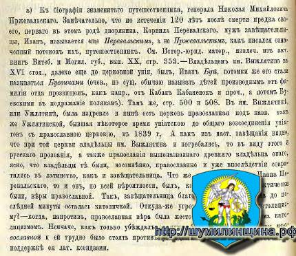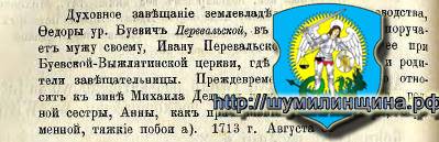 Духовное завещание землевладельца Вит. Воеводства Федоры рожд. Буевич Перевальской в коем, между прочим поручает мужу своему, Ивану Перевальскому, похоронить ее при Буевской-Выжлятинской церкви, где была погребены и родители завещательницы 1713 г. августа 3. Владельцем им. Выжлятина в XVI ст., далеко еще до церковной унии был Иван Буй, потомки же его стали называться Буевичами (очевидно, по существовавшему обычаю называть детей производным от фамилии отца прозвищем, а потом Буевскими в подражание полякам.) В им. Выжлятине или Ужлятине издревле есть православная церковь под названием так же Ужлятинская, бывшая некоторое время униатской до общего воссоединения церквей в 1839 г. Издание Юридических Материалов, 21 вып. Стр. 144