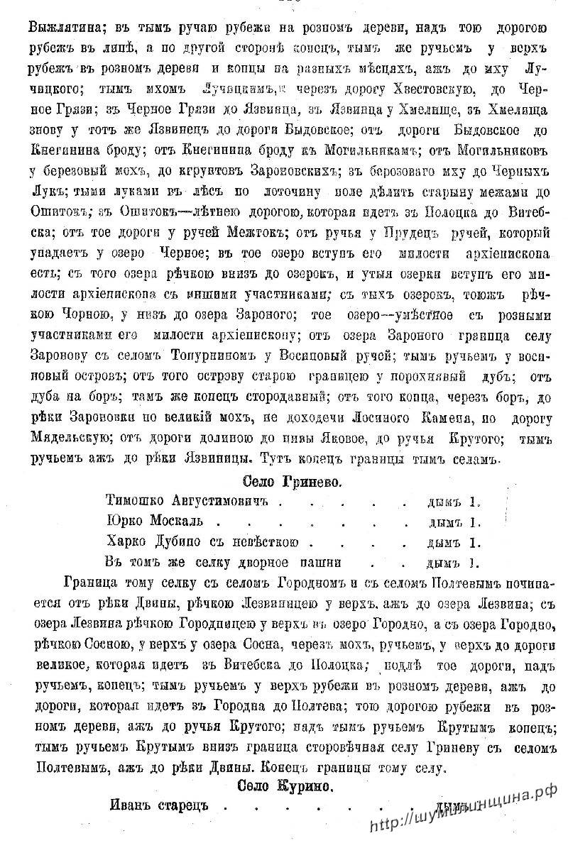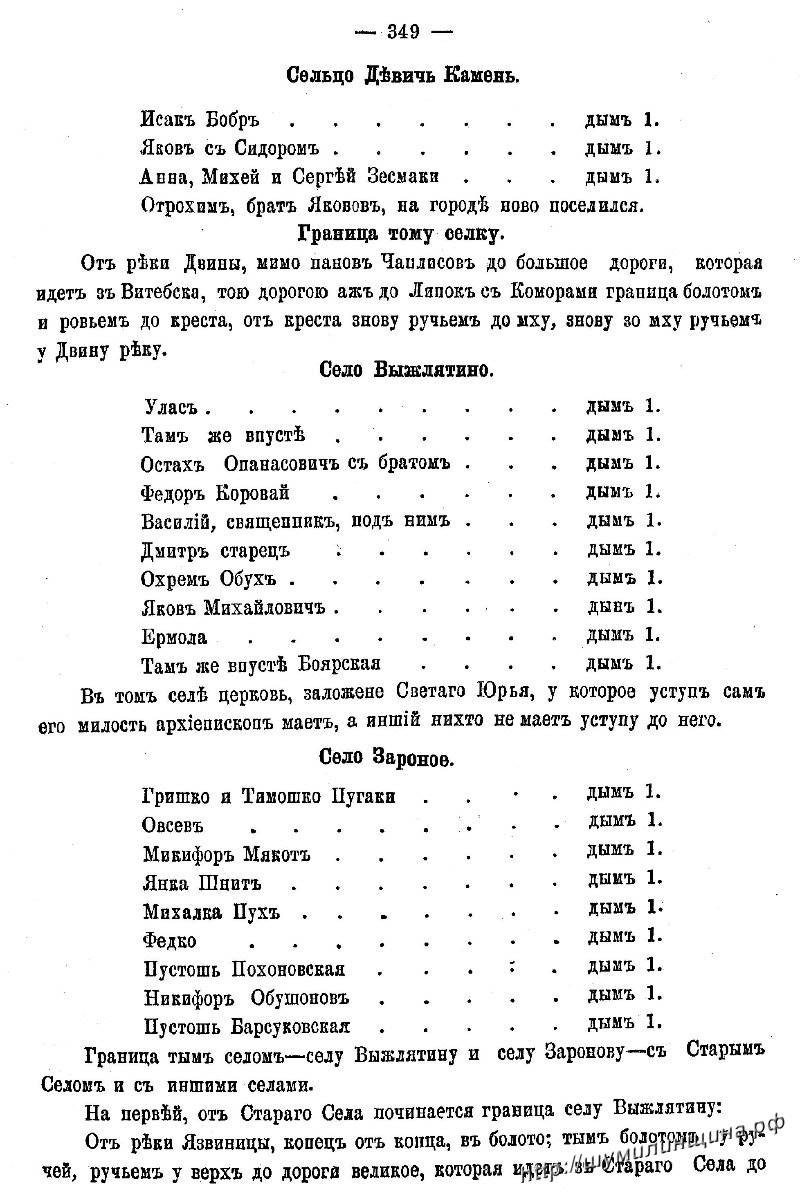 Граница тым селам - Выжлятину и селу Заронову - с Старым Селом и иншими селами. На первей, от Старого Села починается граница с. Выжлятину: От реки Язвиницы, копец от копца, в болото; тым болотом у ручей, ручьем у верх до дороги великое, которое идет за Ст. С. до Выжлятина в тым ручью рубежы на розном дереви, над тою дорогою рубеж в липе, а по другой стороне копец, тым же ручьем у верх рубеж на розном дереви и копцы на разных месцях, аж до мху Лучацкого; тым мхом Лучацким через дорогу Хвестовскую до Черное Грязи, з Черное Грязи до Язвинца, з Язвинца у Хмелице, з Хмелице знову у тот же Язвинце до дороги Быдовское; от дороги Быдовское до Кнешнина брода; от Кнешнина брода к Могильникам, от Могильников у березовый мох, до кгрунтов Зароновских; за березового мху до Черных Лук; тыми луками в лес по лоточину поле делить старыну межами до Ошиток; з Ошиток - лежнею дорогою, которая идет з Полоцка до Витебска от тое дороги у ручей Межток, от ручья у Прудец ручей, который упадает в озеро Черное; в тое озеро вступ его милости архиепископа есть; с того озера речкою вниз до озерок, и утые озерки вступ его милости архиепископа с иншими участниками; с тых озерок, тоюж речкою Чорною у низ до озера Зароного; тое озеро - уместное с розными участниками его милости архиепископу; от озера Зароного граница селу Заронову с селом Топурином у Восиновый ручей; тым ручьем у восиновый остров; от того острову старою границею у порохнявый дуб; от дуба на бор; там же копец стародавный; от того копца; через бор, до реки Зароновки по великий мох, не доходечи Лосиного Каменя, по дорогу Мядельскую; от дороги долиною до нивы Яковое, до ручья Крутого; тым ручьем аж до реки Язвиницы. Тут копец границы тым селам.