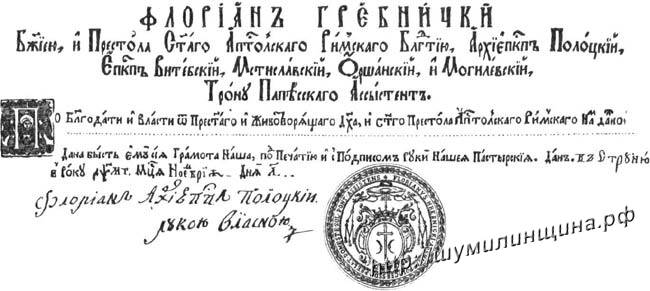 Очень любопытен приведенный документ в отношении Флориана Гребницкого. Отец его, Михаил, был казначеем Витебского воеводства, Флориан (Florian Hrebnicki) род. ок. 1683г., в 1716 году стал униатским епископом Витебска, а в 1717м - Полоцким архиепископом. Участник Замойского собора (1720), четвертым, как и следовало ему по рангу, подписал его решения. В 1727-1730г. побывал в Риме, где познакомился с кардиналом Ламбертини, ставшим в 1740 г. папой римским Бенедиктом ХIV, который назначил Гребницкого ассистентом папского трона. Усилиями Флориана в 1738-1750гг. в Полоцке был восстановлен и перестроен разрушенный в ходе Северной войны (1700—1721) Софийский собор. Архиепископ Флориан (Гребницкий) сыграл важную роль в изменении сакральной архитектуры ВКЛ, кроме Софийского собора, им было перестроено за счет собственных средств несколько наиболее значительных святынь на территории полоцкой епархии (в т.ч и кафедральный собор и церковь св. Николая в Вильно). С 16.12.1748 г. и до конца своей жизни занимал киевскую униатскую митрополичью кафедру, митрополит "Киевский, Галицкий и всея Руси» грекокатолической церкви. Умер 18.07.1762 году в имении Струнь под Полоцком. Был похоронен в Полоцке в стене Софийского собора возле алтаря.