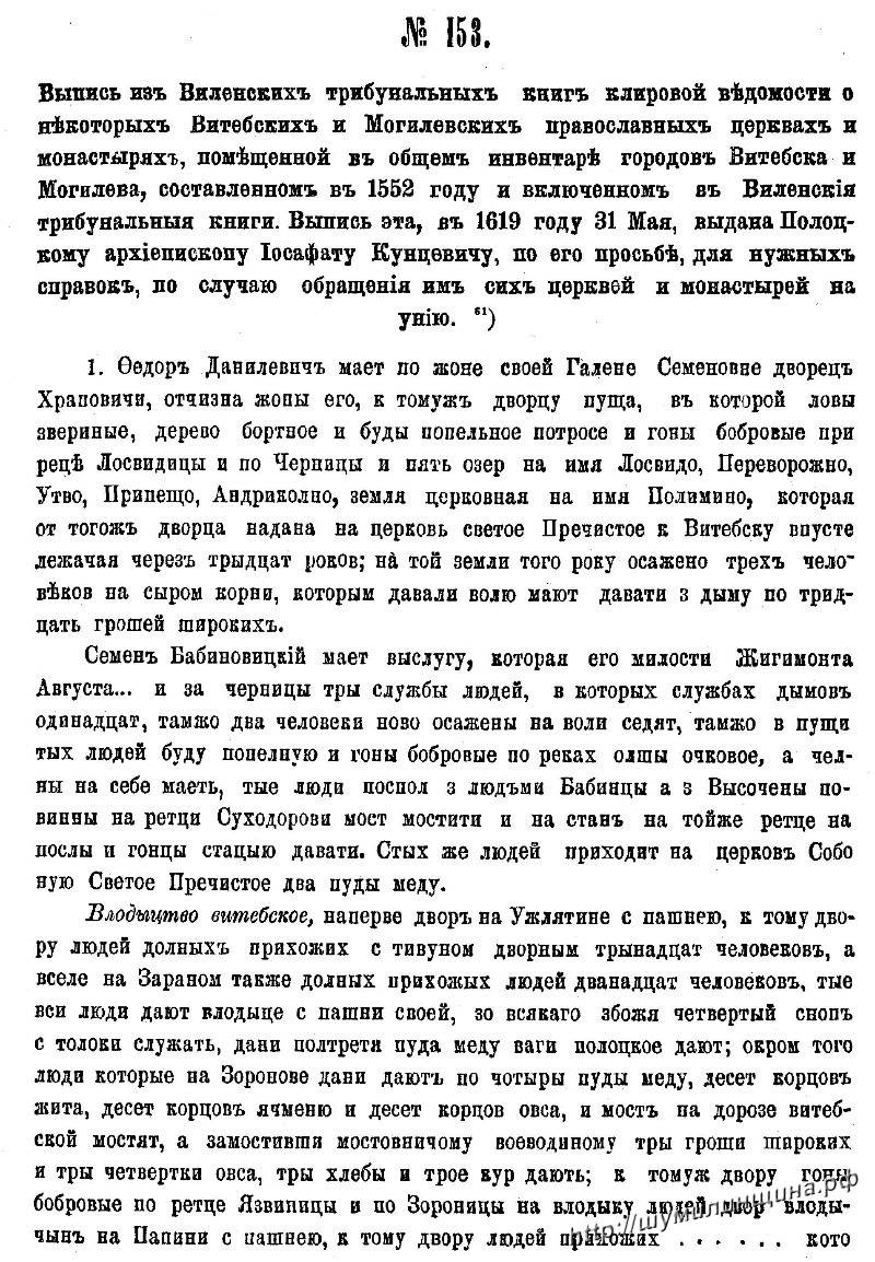 Выпись из Виленской трибунальной клировой ведомости о некоторых Витебских и Могилевских православных церквах и монастырях, помещенной в общем инвентаре городов Витебска и Могилева, составленном в 1552 г. и включенном в Виленские трибунальные книги. Выпись эта, в 1619 году 31 мая, выдана Полоцкому архиепископу Иософату Кунцевичу, по его просьбе, для нужных справок, по случаю обращения им сих церквей и монастырей на унию.