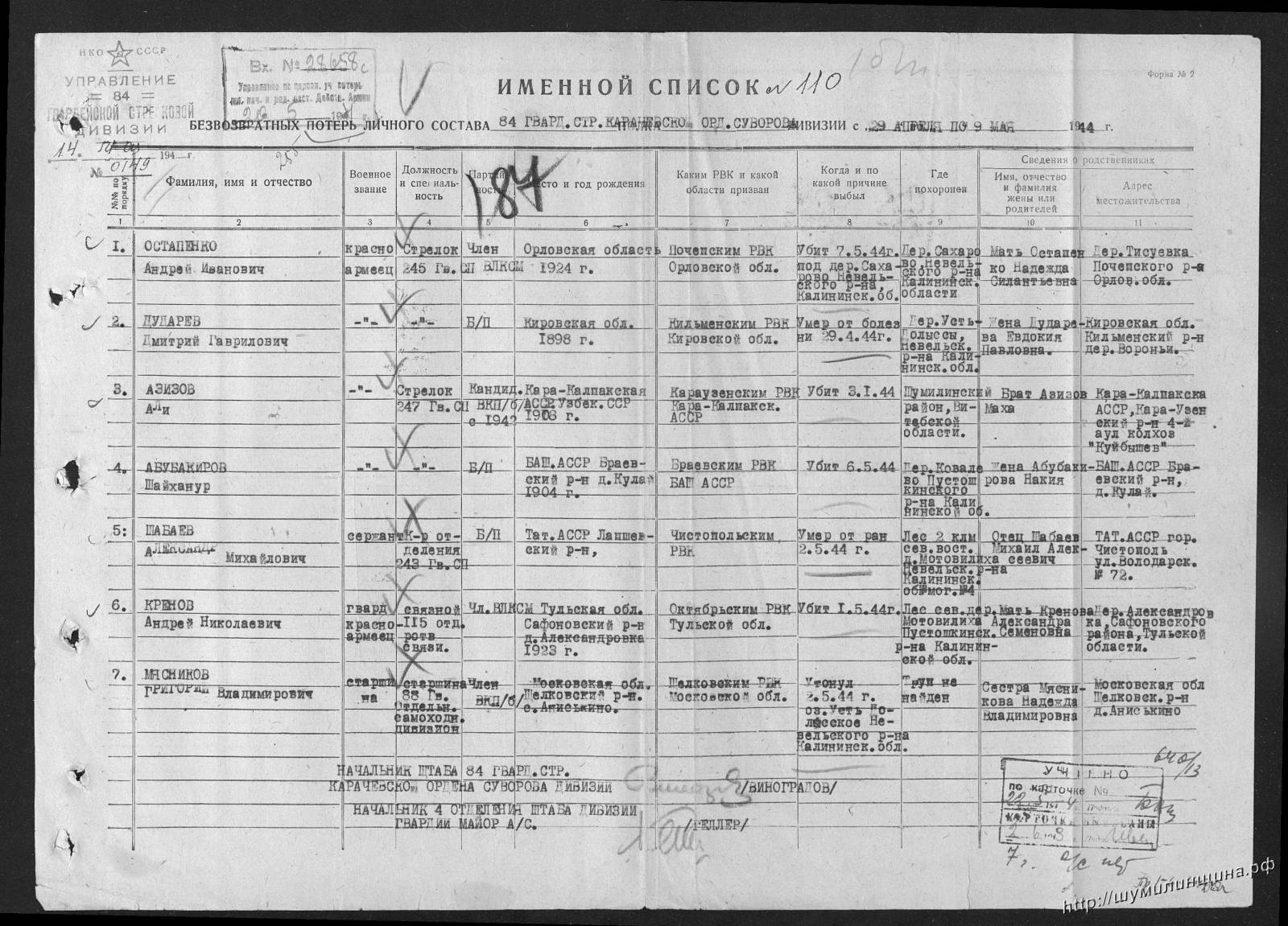 Юрий, согласно донесению 6948, в могиле номер 73 северозападнее д.Пухи, Сиротинского района, похоронены ещё 4 воина вместе с Каймаковым Григорием Степановичем. Но их я тоже не нахожу в списках перезахороненных во Дворище и Свободе. Может быть их и не перезахоранивали. Такое возможно?