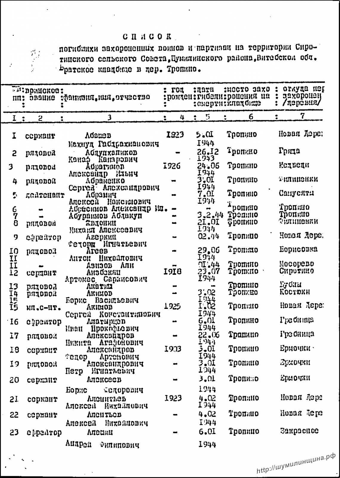 Марина я уже написал ранее, что речь идёт о деревни Пухи рядом с деревней Волково, а не Жеребичи. Это следует из донесений 381СД в январе 44-го. После войны Сиротинский район был ликвидирован, часть территории теперь Шумилинский, а Волково оказалось в Витебском. Основные захоронения там в Зароново и Старом Селе, наболее вероятно что из д.Пухи был перенос в Старое Село, оно рядом, собственно и бои в том районе шли за выход к жд станции Старое Село. Поэтому спишитесь с Витебским райисполкомом, приложите карты, выписки Мемориала и журнала боевых действий. Дворище - другой район. Что касается перезахоронений - смотрите по потерям, за 10 дней января только в 381-й дивизии счет потерь на сотни, 17.01 дивизию выведут на пополнение, т.е там останется примерно от четверть первоначального состава 12 тыс. Очень много записей о погибших: остался на территории противника - т.е пошли в атаку, многие погибли под огнем пулеметов-артиллерии, оставшиеся откатились на исходные. Сколько всего тут полегло в снегу, лесах и болотах за пару месяцев 44-го - никто не скажет, официально похоронено около 11тыс чел. Скорее всего физические перезахоронения произведены в 70-х годах в централизованные братские захоронения, в том же Старом Селе много упоминаний о 381СД. Но списки перезахороненных далеко не полные, их дополняют каждый год, добавляют таблички. Скорее всего так и в Вашем случае, но официально Вам ответит только райисполком.